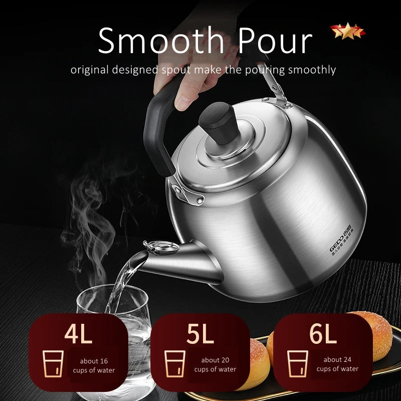 Contrairement aux modèles électriques qui tombent souvent en panne, notre bouilloire sifflante vous accompagnera pendant de longues années. Sa poignée en bakélite résistance à la chaleur vous protège des brûlures, même lorsque l'eau bout à l'intérieur. Plus besoin de surveiller votre eau : le sifflement caractéristique vous avertit au moment parfait ! Disponible en trois capacités généreuses (4, 5 et 6 litres), elle s'adapte parfaitement à vos besoins, que vous prépariez un thé seul ou pour toute votre famille.