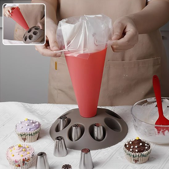 Avez-vous déjà ressenti de la frustration en décorant vos gâteaux ? Ce socle de sac à en silicone alimentaire de haute qualité offre une prise en main exceptionnelle. Ce socle vous permet d'y glisser un sac soit en silicone ou jetable, Sa texture douce et son épaisseur parfaitement calibrée permettent un contrôle précis du débit de crème ou de glaçage. Contrairement aux poches jetables trop fines ou trop rigides, celle-ci épouse naturellement la forme de votre main, notamment la fatigue lors des longues séances de décoration.